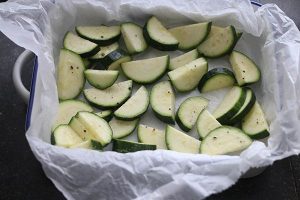 3. Bekleed een ovenschaal of bakplaat met bakpapier en verdeel hier de courgette over. Bak deze alvast 7 minuutjes in de oven.