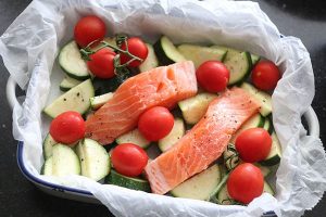 6. Verdeel ook de tomaatjes over de courgette en zalm.