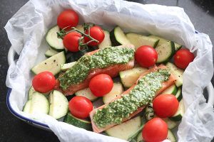 5. Haal de courgette uit de oven en schep om. Leg de stukjes zalm erop, bestrooi met een snufje peper en zout en besmeer de bovenzijde royaal met pesto.