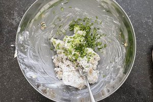 2. Hak de bieslook en walnoten fijn en roer ook door de roomkaas en breng op smaak met een snuf peper en zout.