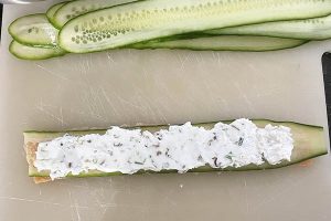 5. Neem een strook komkommer en verdeel plakjes zalm over. Draai om zodat de zalm aan de onderkant zit en bestrijk de bovenzijde van strook komkommer met wat van het roomkaasmengsel.