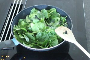 1. Verwarm de oven op 200 graden. Bak de spinazie in etappes in een grote pan tot deze geslonken is. Snijd de zalm in dunne plakken.