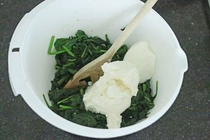 2. Druk met een lepel zo veel mogelijk vocht uit de spinazie in een zeef of vergiet. Doe de geslonken spinazie in een kom en voeg de ricotta en melk toe en meng door elkaar. Breng op smaak met een flinke snuf peper, zout en knoflook.
