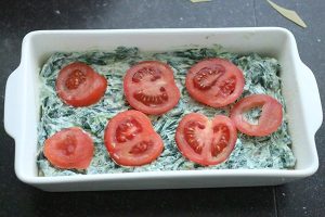 3. Vet de ovenschaal in en verdeel een beetje (ca ⅕ deel) van het spinazie mengsel over de bodem. Leg hier 3 a 4 lasagnevellen op. Verdeel hier wat van het spinazie mengsel (ca ⅕ deel) over en de helft van de plakjes zalm. Dek weer af met lasagnevellen en schep er weer een beetje van het spinazie mengsel over en 1 tomaat in plakken.