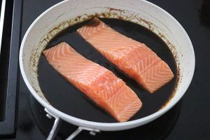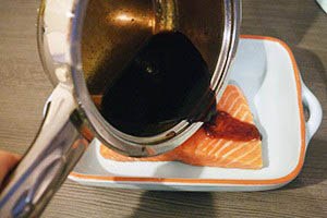 2. Je kunt hem ook bereiden in de oven. Bereid de saus volgens de aanwijzing en schenk deze voor de helft in een ovenschaal, leg de zalm er en in en schenk de rest van de teriyakisaus er over. Bak de zalm teriyaki 12 minuten op 200 graden. Schep tussendoor een keer wat saus over de bovenzijde (zie foto 3).