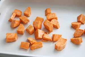 3. Leg in een ovenschaal en besprenkel met een beetje olie, peper en zout. Bak de zoete aardappelblokjes 10 minuten.