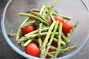 4. Doe de tomaatjes, asperges/bimi en grof gesneden rode ui in een kom en besprenkel ook met een beetje olie en zout.