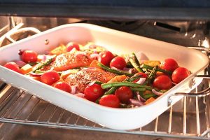 6. Haal de zoete aardappel uit de oven en voeg de tomaatjes, asperges en rode ui toe en schep er doorheen. Leg de zalm ertussen en zet de bakplaat nog 12 minuten in de oven op 200° graden. De zalm mag nog iets rosé zijn van binnen.