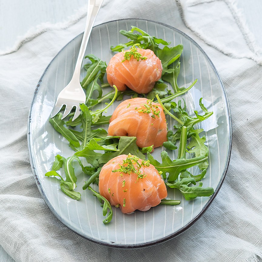 Vorm nu een balletje van de gerookte zalm en gebruik de folie om een mooie ronde bonbon te vormen. Verdeel de geraspte limoen over de zalmbonbons.