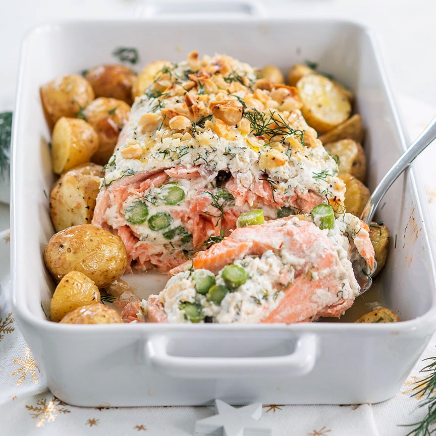 13. Zet de zalmrollade ca. 20-25 minuten in de oven. Hij mag nog een beetje rosé zijn vanbinnen. Voeg de laatste 10 minuten de aardappels toe rondom de zalmrollade en warm nog even mee.
