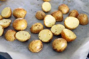 2. Was de aardappeltjes, dep droog en snijd in grote gelijke stukken. Leg ze op een bakplaat met bakpapier, besprenkel met olie en bestrooi met een snuf peper en zout.