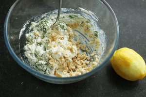 5. Doe de ricotta in een kom, voeg de citroenrasp, dille en een snuf peper en zout en de helft van de hazelnoten erbij en meng door elkaar.