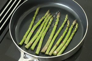 6. Snijd ongeveer 2 cm van de asperges af aan de uiteinden. Snijd dikkere asperges eventueel in de lengte doormidden. Bak de 3 minuutjes in een koekenpan.