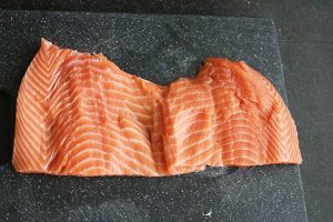 8. Snijd de zalm met een groot scherp mes horizontaal open, maar net niet helemaal tot het eind. Klap de zalm open.