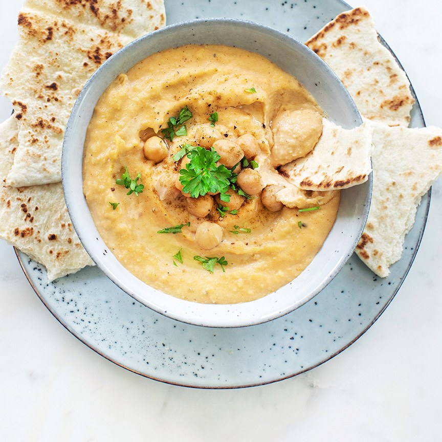 Serveer de zelfgemaakte hummus met wat (pita)brood. Bewaar de hummus in een goed afgesloten bakje in de koelkast.
