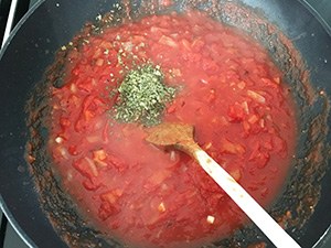 1. Verwarm de oven op 200 graden. Snipper de ui en knoflook fijn en fruit aan in een pan. Voeg de tomatenblokjes toe en de Italiaanse kruiden. Breng de tomatensaus op smaak met peper en zout. Laat het mengsel ca 20 min pruttelen.