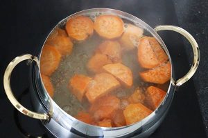 2. Verwarm een pan met water en breng aan de kook. Voeg de zoete aardappel toe en kook ze in 15 tot 20 minuten gaar.