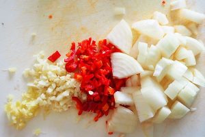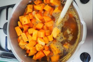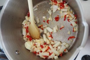 1. Schil de zoete aardappel en de wortel en snijd deze in stukken. Snipper de ui en snijd de knoflook, gember en rode peper fijn. Indien je het liever niet zo pittig wilt, verwijder dan de zaadlijsten uit de rode peper. Verhit een pan grote op het vuur en fruit hierin de knoflook, ui, gember en rode peper aan. Voeg vervolgens de zoete aardappel en wortel toe en bak dit even mee.