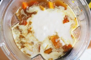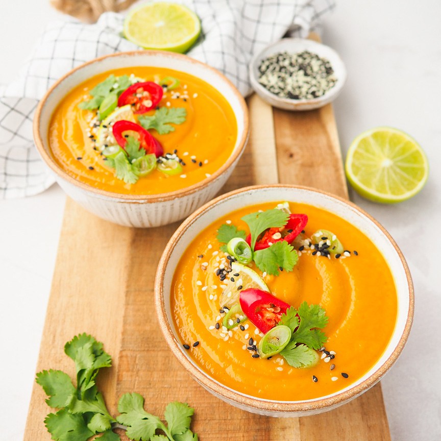 3. Voeg nu de kokosmelk toe en mix de soep glad met behulp van een staafmixer of een blender. Pers het sap van 1 limoen uit en voeg dit toe aan de soep. Serveer de soep met verse koriander, bosui en sesamzaad.