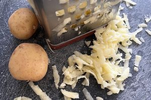1. Schil de rauwe aardappels en rasp ze daarna met een grove rasp.