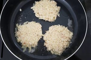 7. Maak hoopjes van het zuurkool mengsel en druk plat tot koekjes. Bak beide kanten goudbruin en zorg dat ook de binnenzijde gaar is. Dit duurt ca. 5 tot 7 minuten.