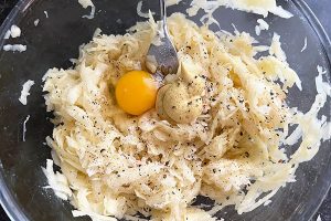 3. Doe de rasp van de aardappel in een kom en voeg de zuurkool toe.