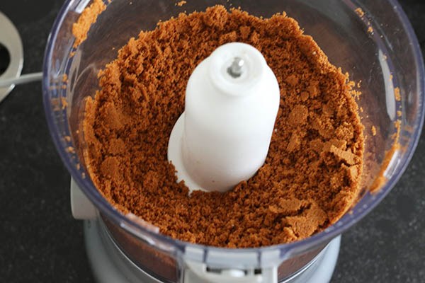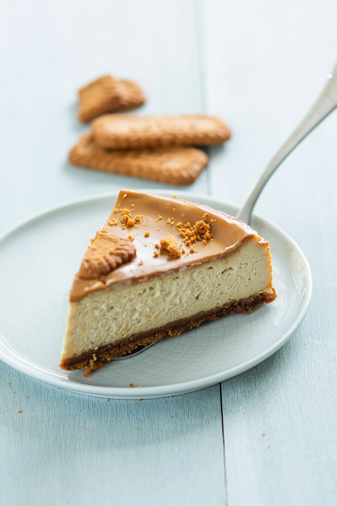 Verwarm de oven op 150 graden en bekleed de springvorm volledig met bakpapier. Zet ook het kommetje met water vast in de oven. Maal de koffieleutjes fijn in de keukenmachine en smelt ondertussen vast de boter. Voeg beide ingrediënten samen, schep even goed om en stort de bodemmix in de springvorm. Druk de bodem stevig aan. Klop voor het cheesecakebeslag de roomkaas met de crème fraîche, kristalsuiker, Speculoospasta, koek- en speculaaskruiden en het vanille aroma romig. Voeg een voor een de eieren toe en tot slot ook de eidooier en maïzena.