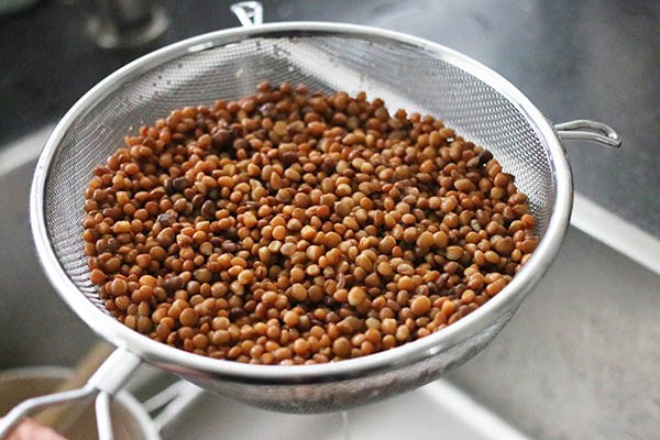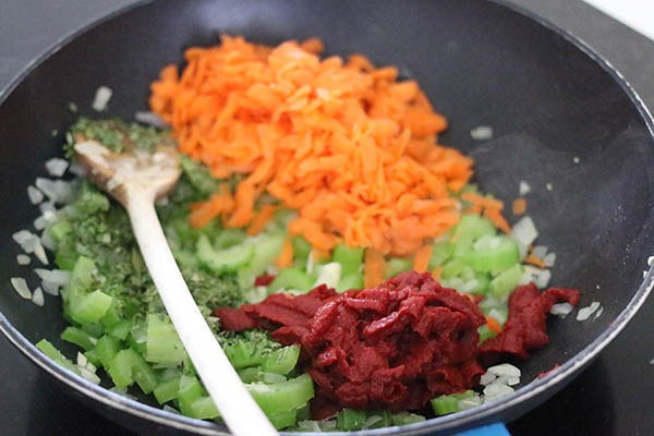 HOOFDGERECHT – 50 MINUTEN – 4 PERSONEN Ingredienten 400 gr gedroogde bruine linzen (of een zak of blik van 400 gr voorgekookte linzen) 500 gr tomaten, in vieren 10 zongedroogde tomaten 15 gr basilicum 2 uien, fijngesneden 2 stengels bleekselderij, in reepjes 2 teentjes knoflook, geperst 100 gr wortels, geraspt 10 gr rozemarijn, fijngehakt 3 eetlepels tomatenpuree 300 gr spaghetti Olijfolie Zout en peper Bereiding Spoel de linzen schoon met koud water. Kook de linzen in 25 minuten gaar in ruim water en giet af. Plaats intussen de tomaten, zongedroogde tomaten en de helft van het basilicum in de keukenmachine en blend tot een saus. Verwarm wat olie in de stoofpan en fruit de ui en bleekselderij ongeveer 3 minuten. Voeg het knoflook toe en bak 2 minuten mee.