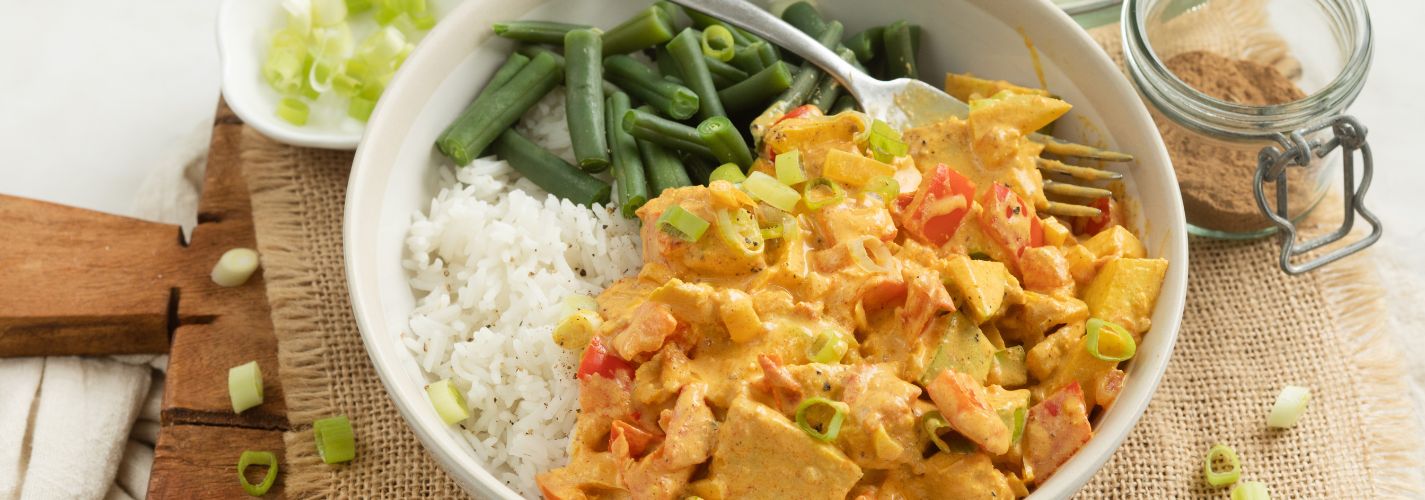 Maak zelf deze verse kip madras zonder pakjes en zakjes. Een romig en kruidig mengsel van stukjes kip, paprika en appel geserveerd met rijst en boontjes.
