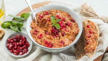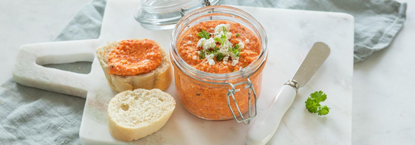 Deze spread gemaakt van feta en geroosterde rode paprika’s kleur heerlijk oranje. De spread is erg lekker op een toastje of stukje stokbrood