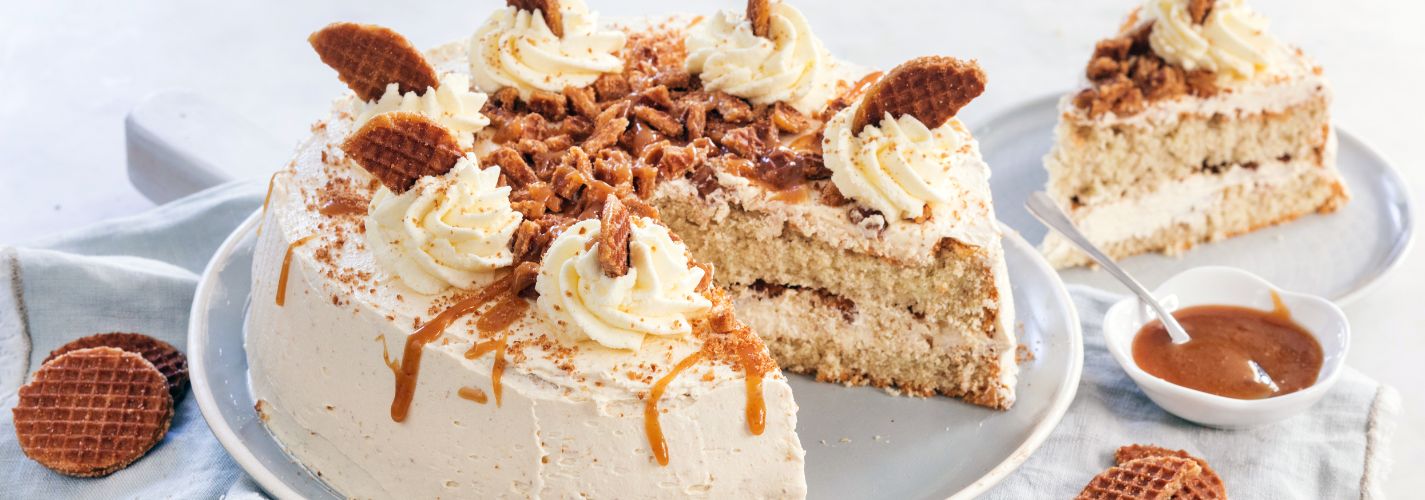 Heerlijke luchtige biscuittaart met een vulling van karamel botercrème en stukjes stroopwafel, een prachtige traktatie voor een verjaardag of feestje.