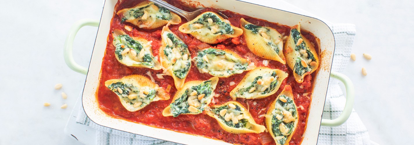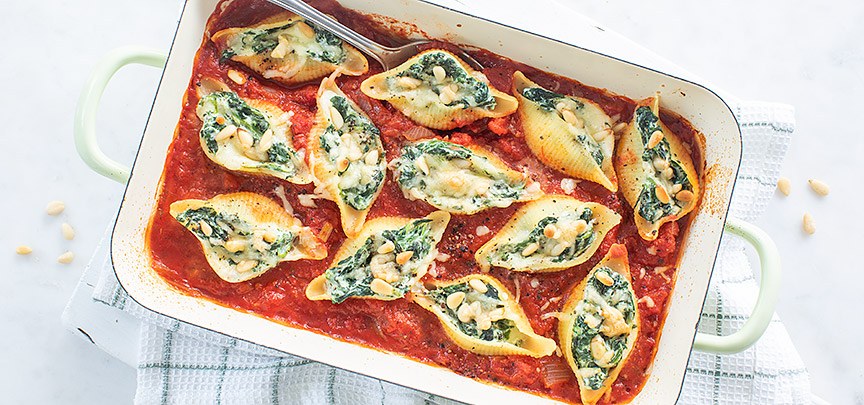 Vegetarische pastaschotel met grote pastaschelpen (conchiglioni) gevuld met ricotta en spinazie in een heerlijke tomatensaus