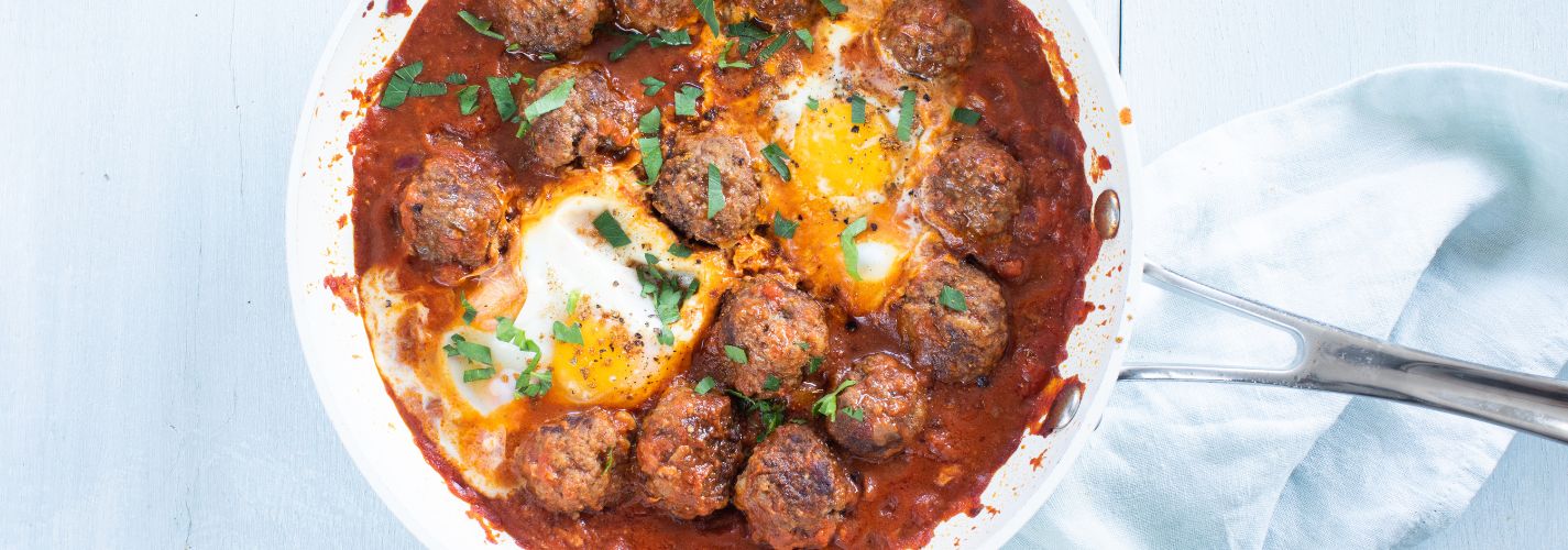 Heerlijke kruidige Marokkaanse gehaktballetjes in een smaakvolle tomatensaus met hierin gestolde eieren, lekker met couscous!
