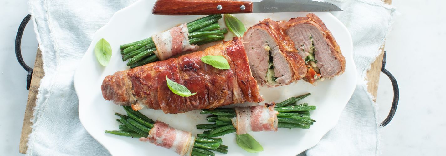 Een perfect pronkstuk voor op tafel: gevulde varkenshaas met o.a. pesto, mozzarella en tomaatjes omwikkeld met licht knapperig gebakken parmaham