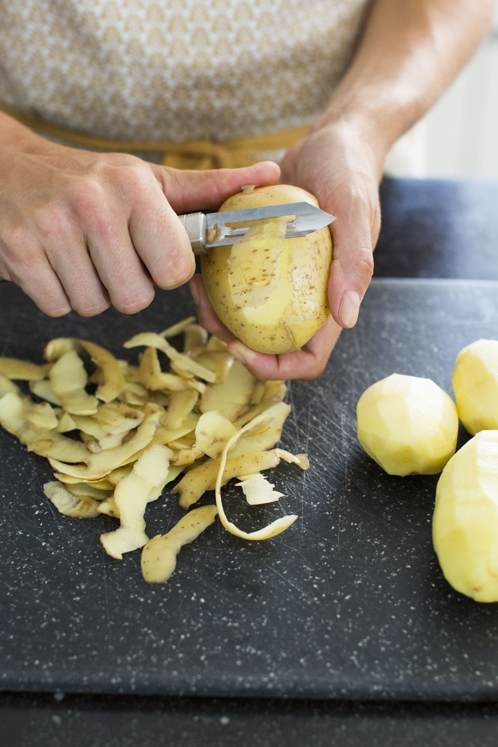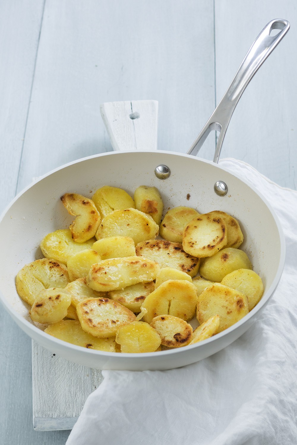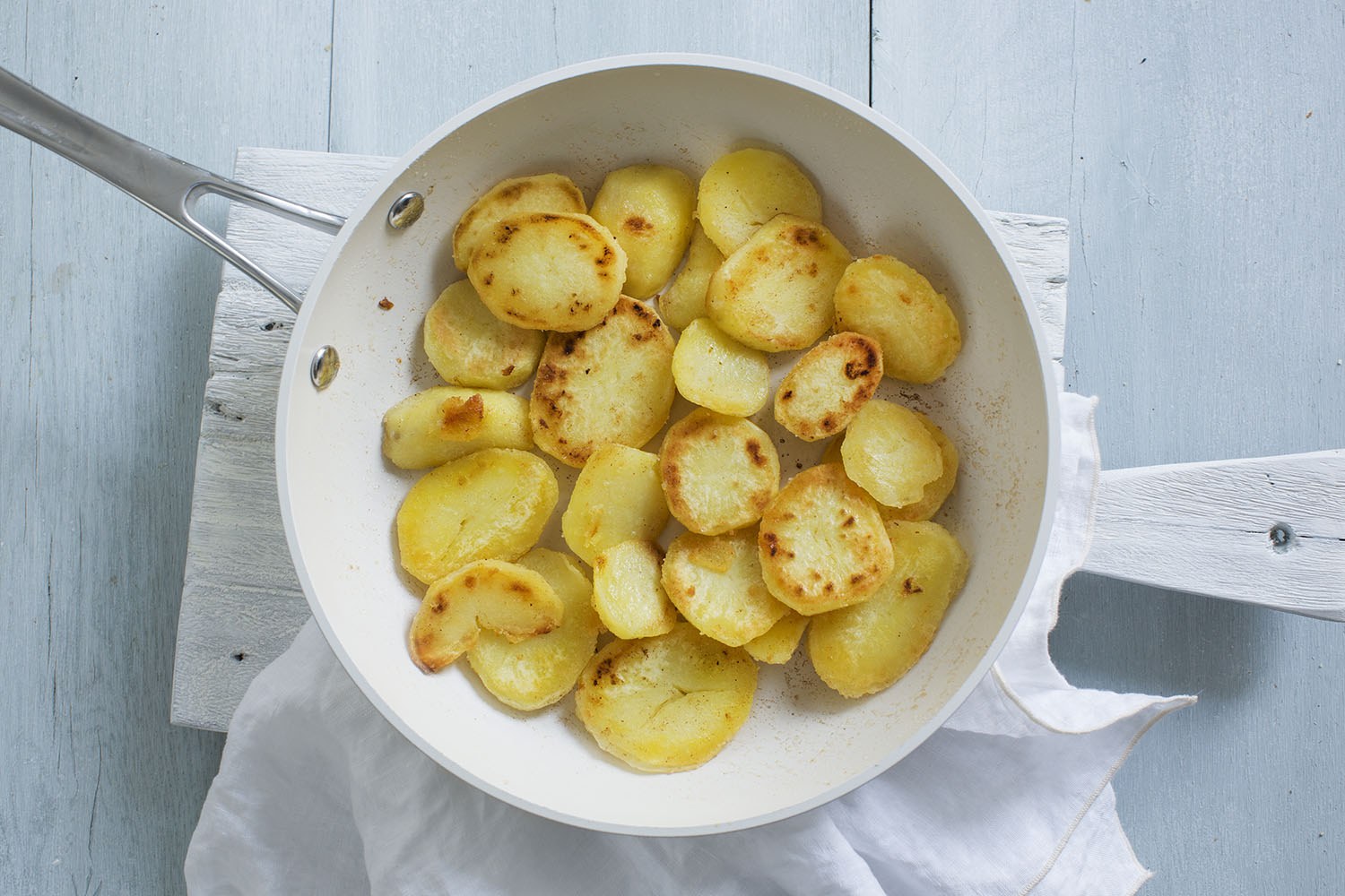 - Nadat ik de aardappels geschild heb en in dikke schijfjes heb gesneden van ca. 5 mm kook ik ze 5 minuten in een pan met een ruime hoeveelheid water. Giet ze af en laat zie uitdampen tot ze droog zijn (je kunt ze ook in de koelkast bewaren en de volgende dag opbakken).