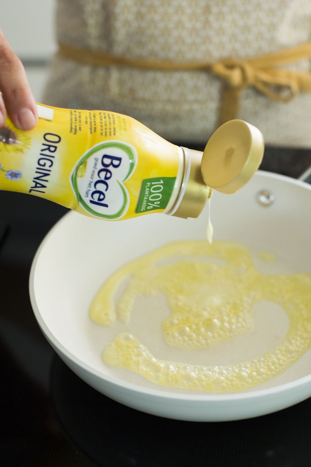 Margarine – Vloeibare margarine is ideaal om mee te bakken en braden. Zelf gebruik ik vaak een flesje Becel Original, deze bakt mooi bruin en spettert niet snel. Zonnebloemolie, koolzaadolie en lijnzaadolie vormen de basis voor dit product en je hebt dus alle voordelen van deze plantaardige oliën in 1x in de pan. Daarnaast bevat dit bak- en braadproduct een grote hoeveelheid omega 3 dat bijdraagt aan het behoud van een gezond cholesterol en ook nog eens een mooi hoeveelheid vitamine A, D en E. Het rookpunt van dit product ligt tussen de 220 en 250 graden.