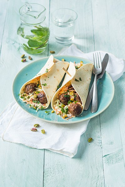 Meng het gehakt met het ei, paneermeel, paprikapoeder, komijn, peper en zout. Kneed er kleine gehaktballetjes van. Bak deze in een pan met een beetje olie of boter goudbruin en gaar in ca. 10 minuten. Meng ondertussen de ingrediƫnten voor de dressing door elkaar in een kommetje. Schep deze vervolgens door de witte kool, gesnipperde rode ui en de peen julienne. Verwarm de wraps volgens de verpakking. Verdeel wat van de koolsalade over de wraps en leg de gehaktballetjes hierop. Bestrooi met wat grof gehakte peterselie en pistache. Vouw de wraps dicht en steek vast met een prikkertje.