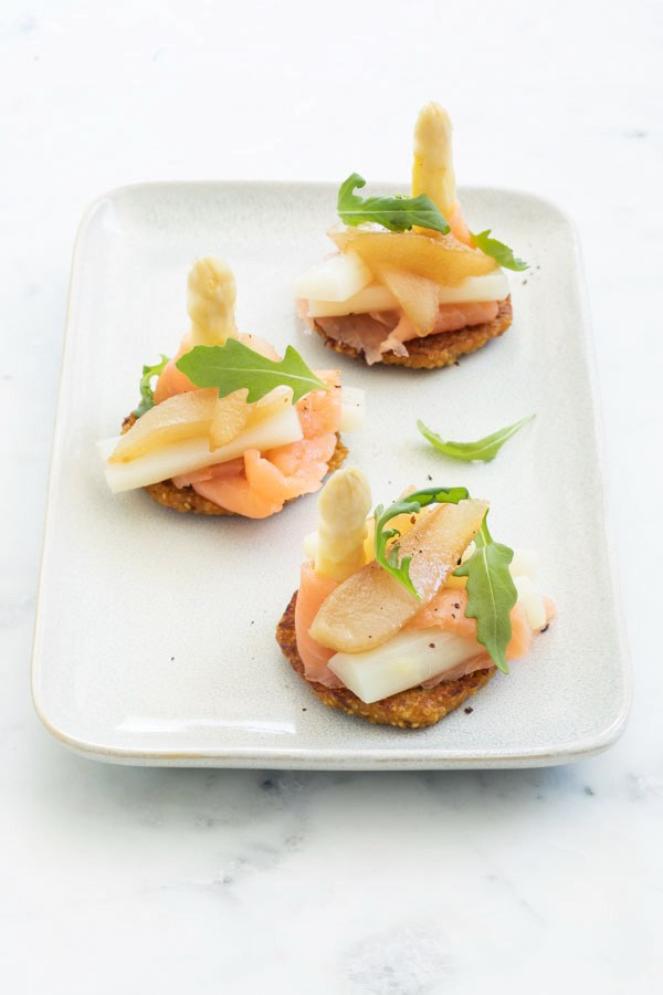 Voorgerecht: gerookte zalm met quinoa poffertjes, zoetzure peer en Brabantse asperges