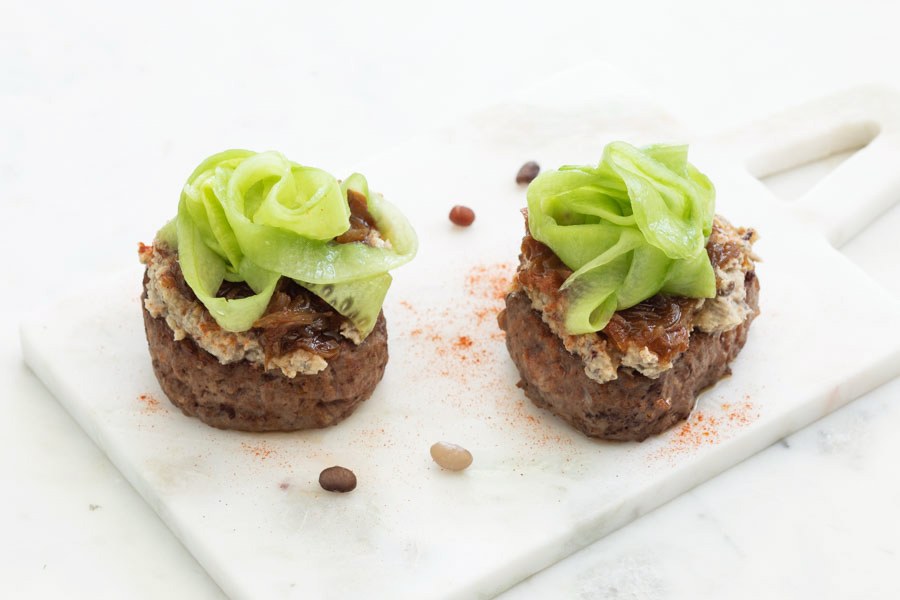 Dresseer de hamburgers op een plank, besmeer met een dikke laag bonen humus en bestrooi met paprikapoeder. Vervolgens een lepel uiencompote op de humus, en als laatste de aangemaakte komkommersalade. Serveer met de ketchup.