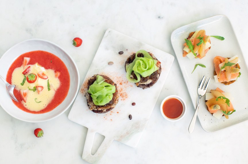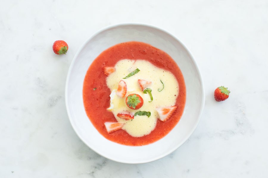 Dessert: aardbeiensoep met hangop van yoghurt en sabayon van scharreleitjes
