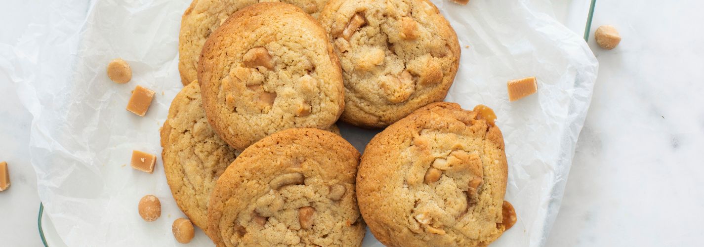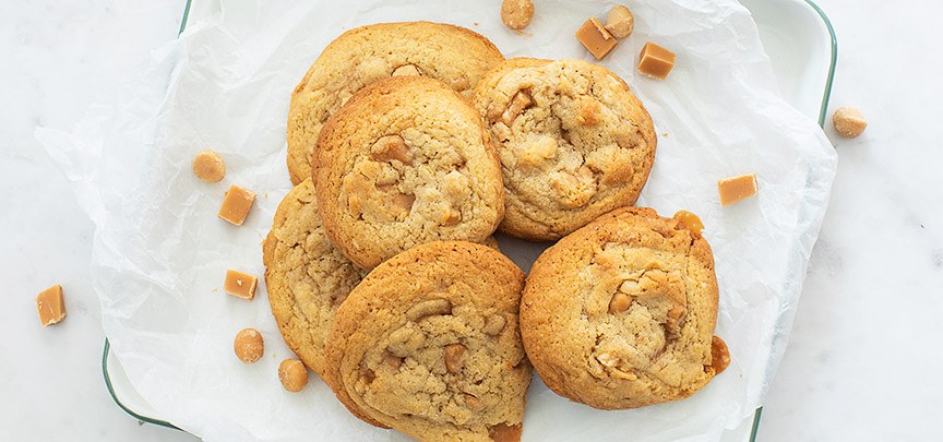 Lekkere grote koeken met stukjes gezouten macadamianoten en stukjes zoete fudge die een heerlijke smaakexplosie geven in je mond.